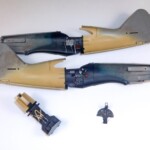W moim modelu jako kolor granatowy użyłem Mr. Paint MRP-14 ANA623 Sea Blue, a jako kolor Chamois beżową farbę Mr. Paint MRP-258 Clear Doped Linen Variant 2. Dla odróznienia koloru brezentowego obicia fotela pomalowałem je pędzlem Tamiyą XF-50 Field Blue. Poduszkę na siedzeniu pilota i rękojeść drążka sterowania mieszanką 1/4 Vallejo Model Air 004 Blue + 1/4 Vallejo Model Air 018 Camouflage Dark Green + 1/2 Vallejo Model Air Black. Mimo, że nawet fotel z „tapicerką” był całkowicie granatowy, to w kokpicie były skrzynki, przyrządy, instrumenty, które malowane były na dość jasny (przez kontrast z granatowym) szary kolor. Nie znalazłem żadnych infromacji na temat odcienia tej barwy i założyłem, że użyto po prostu kamuflażowego szarego z górnych powierzchni. A do kamuflażu od samego początku zamierzałem wypróbować zestaw Hataka Orange, więc elementy w kokpicie uzyskały barwę Hataka Orange C082 Gris Bleu Foncé.
