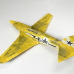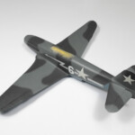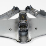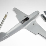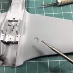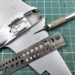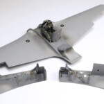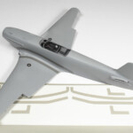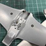 Nic już nie stało pomiędzy mną, a sklejeniem kadłuba i przyklejeniem płata. Spasowanie przejścia szkrzydło – kadłub jest w modelu Zvezdy wzorcowe. Nie było żadnych szpar, ani konieczności zbierania naddatku plastiku. Ale nie oznacza to, że można połączenie skrzydła i kadłuba zostawić samemu sobie po sklejeniu. Podział pomiędzy tymi dwoma elementami jest w modelu położony nieco niżej, niż górna krawędź oprofilowania miejsca łączenia w rzeczywistym samolocie. Zaszpachlowanie połączenia nieuchronnie musi więc doprowadzić do zatarcia linii podziałowej zlokalizowanej około milimetr wyżej. Zamiast szpachlować linię podziału między skrzydłem, a kadłubem w klasyczny sposób postanowiłem zrobić imitację nałożonych na powierzchnię płatowca blaszanych oprofilowań. Żeby to zrobić opracowałem najpierw w Corelu szablon, który wyciąłem Stiką z folii Oramask. Oramask jest do tych celów idealny, bo jest bardzo odporny na ścieranie. Wycięte maski nakleiłem na model i przestrzeń między nimi wypełniłem mieszaniną Mr. Dissolved Putty i kleju cyjanoakrylowego UHU. Taka mieszanka jest bardziej miękka niż sam klej CA, ale nieco twardsza od bardzo plastycznej i łatwo ścieralnej szpachłówki Mr.DP. Obrobiłem zgrubsza oprofilowania, zalałem te rejony kilkoma warstwami Mr. Surfacera i zabrałem się za ponowne szlifowanie. Był to proces upierdliwy. Ścieranie, uzupełnianie Surfacera, ścieranie, uzupełnianie Surfacera i tak w kółko. Po uzyskaniu akceptowalnych oprofilowań dodałem poprzeczne kawałki folii maskującej i natrysnąłem na oprofilowania warstwę Tamiya Liquid Grey Primer, żeby zasymulować krawędzie blach na zakładkę – każde oprofilowanie składało się z trzech wytłoczonych blach. Na końcu wgniotłem igłą lekarską imitacje dużych nitów. Przy okazji, do wygniatania nitów nie warto spiłowywać skośnie ściętego „ostrza” igły. Drugi koniec igły, który zatopiony jest w plastikowej nasadce na strzykawkę jest pięknie obrobiony i ma zwężone na końcu ścianki. Idealny wgniatacz nitów. Wystarczy wyrwać końcówkę z nasadki i narzędzie gotowe. Cały proces robienia oprofilowania dał w mojej ocenie (cierpię na lekki narcyzm) całkiem fajny efekt. Ale jest to proces mozolny, który zajął mi całe dwa „standardowe wieczory modelarskie”.