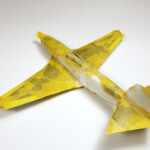 Po chwili relaksu przy malowaniu kamuflażu zabrałem się za bardziej wymagającą robotę, czyli malowanie oznakowania. W pudełku można znaleźć co prawda gotowe kalkomanie do Jaka-3 Alberta, ale mają one swoje wady. Zarówno strzała, jak i szóstka mają niepoprawny kształt. Strzała i szóstka na lewą i prawą połówkę kadłuba mają taki sam kształt, a w oryginalnym Jaku lewa i prawa połowa nieco się różniły (zakładając oczywiście, że zdjęcia Jaka z lewej i prawej strony dotyczą tego samego samolotu). Biały na kalkomaniach jest wszędzie taki sam, a na oryginale strzały były nieco ciemniejsze, niż szóstka i białe lamowania gwiazd. Wreszcie kalkomanie Zvezdy, choć doskonale regują na płyny, są jak dla mnie ciut zbyt grube. Tak więc chcąc nie chcąc znowu odpaliłem Corela i namalowałem własne wzory oznakowania, które poszły od razu do mojej Stiki. Zdecydowałem, że białe (jaśniejsze i ciemniejsze) elementy będę malował od masek, a czerwone elementy gwiazd wydrukuję na laserowym OKIm. Do ciemniejszego białego na strzałach użyłem farby MRP-135 ANA 601 Insignia White, a do jaśniejszego na szóstkach i gwiazdach MRP-004 White. Zaraz po namalowaniu różnica między białymi była wyraźna, ale po późniejszym matowaniu i brudzingu nieco się zatarła. Jakbym podchodził do Jaka z Normandie Niemen, to zastosował bym do malowania strzał jeszcze ciemniejszy odcień białego. Poza tym starając się maksymalnie zachować geometrię długich oznaczeń na kadłubie tym razem niestandardowo użyłem białej i sztywniejszej folii maskującej Oramask. To nie był dobry pomysł. Biała folia zostawia trochę kleju, który potem trudno było usunąć z kadłuba. Mocowanie się z resztkami kleju doprowadziło do tego, że uszkodziłem biały kolor w niektórych miejscach i musiałem nanosić poprawki. Definitywnie nie użyję już więcej białego Oramaska do maskowania na malowanych powierzchniach.