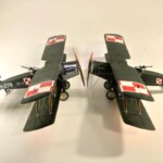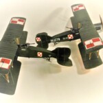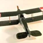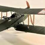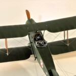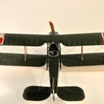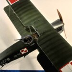 Model Rodena trochę rozczarowuje praktycznie płaskimi płatami. Nie ma tam prawie w ogóle rzeźby płótna pomiędzy wręgami skrzydła, więc pokusiłem się o cieniowanie wszystkich skrzydeł i ogona czarną farbą pryskaną od tasiemki Tamiya tak że z jednej strony była ostra krawędź a z drugiej płynne przejście. Na to wszystko dawałem wiele warstw farby zielonej i „płóciennej” aż osiągnąłem efekt, który mnie zadowalał. Niestety zdjęcia nie oddają tego w pełni no ale taki ze mnie jest już marny zdjęciowiec.