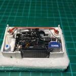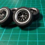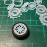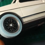 Zachciało mi się tuningować, więc trochę sobie skomplikowałem życie. Autko dostało nowe felgi i opony, „spojlerodaszek” nad tylną szybą, rozpórkę przedniego zawieszenia, pasy bezpieczeństwa, przewody pod maską i pod podwoziem. Największy problem miałem z doborem opon- chciałem obniżyć zawieszenie i wszystkie zestawy opon które dokupiłem ( 2 Aoshima i 2 Fujimi) były za duże. Swoją drogą nigdzie nie mogłem znaleźć danych z rzeczywistymi wymiarami opon sprzedawanych zestawów. Kupowałem na chybił trafił i wydałem więcej na cztery nie potrzebne zestawy waloryzacyjne z felgami i oponami niż na sam model. W końcu opony o żądanych wymiarach narysowałem i wydrukowałem sam.