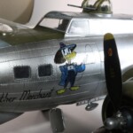 Tak też postanowiłem przedstawić swoją wizję Feather Marchant, już po dopasowaniu lewego skrzydła po 26 Marca 1944 roku. Nie było nigdy zdjęcia pokazującego nazwę i godło maszyny. Z opisów Bill’a i korespondencji z Chris’em, historykiem 447 Grupy Bombowej wiadomy jest numer seryjny i litera wywoławcza „C” na ogonie. Bill opisywał że załoga zdecydowała się na Donalda Ducka w Zoot Suit i umieścił nawet czarno białe zdjęcie ich inspiracji do godła Feather Merchant.