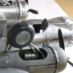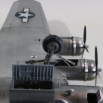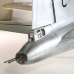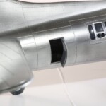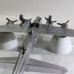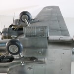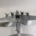 Bombowiec jest tak wielki że z doświadcznia od razu zdecydowałem że malowanie kadłuba i skrzydeł będzie oddzielne. Po prostu cała bryła była za duża i za ciężka żeby ją wywijać w mojej skromnej “skrzynce malowniczej”. Trochę się obawiałem jak to wszystko będzie potem pasować. Z doświadczenia pamiętam pasowanie skrzydeł do Liberatora Revell’a. Nie było to przyjemne i sporo mnie nerwów kosztowało zanim się zlepiło w końcu. W tym przypadku wszystkie obawy były niepotrzebne. HK ma fantastyczny system zawiasów, dzięki którym skrzydła nie tylko idealnie pasują bez najmniejszej szczeliny to jeszcze w ogóle nie potrzeba do nich kleju i praktycznie to mógłbym z powrotem te skrzydła oddzielić do tansportu czy innego głupiego powodu. Otóż skrzydło przystawia się do kadłuba tak mniej więcej centymetr do przodu przed końcowym położeniem. Wciska się je do środka po czym przesuwa do tyłu. Przesuwając się skrzydła przylegają do kadłuba idealnie tak że jak już osiągną swoje zamierzone położenie to umocowanie jest tak stabilne że nie ma mowy o jakiś luzach na łączach. Super system!