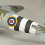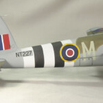 Jeżeli chodzi o malowanie, to od początku wiedziałem jaką konkretną maszynę będę robił (SM-M, nr seryjny NT227 w malowaniu z lipca 1944). Zobaczyłem ten konkretny samolot na zdjęciu Cynka i bardzo mi się spodobał. Oprócz kamuflarzu typowego dla Mosquito FB z tego okresu (które zawsze mi się podobało), moją uwagę zwróciły pasy inwazyjne na tyle kadłuba – bez pasów na skrzydłach i z zamalowanymi literami kodu dywizjonu i zostawioną literą samolotu i numerem seryjnym. Jako że nikt nie robi kalkomanii do tego konkretnego samolotu, z pomocą przyszli znajomi i nowoczesna technologia :). Numer seryjny wydrukował mi Tomasz Gronczewski a maski do dupereli wyciąłem sobie sam na ploterze. Do tego zrobiłem sobie maski na kokpit. Wiem, że pewnie by było szybciej zrobić to „po staroświecku” 🙂 (obłożyć kokpit maską kabuki i wyciąć co trzeba ostrym nożykiem), ale stwierdziłem że jak mam zrobić jeszcze jakieś w przyszłości to czas poswięcony na zrobienie masek nie będzie do końca zmarnowany. Do tego musiałem sztukować szachownicę z napisem „Poland” jakie widać na nosie. Taka ciekawostka. Nie mam pojęcia dlaczego, ale we wszystkich zestawach jakie mam, ten napis jest pod szachownicą a samoloty z tego dywizjonu miały go nad nią. Na szczęście nie było większego problemu z rozcięciem kalek na dwie części i ich „odwrócenia”.