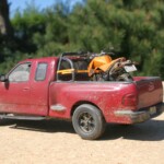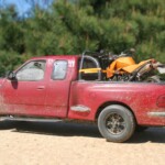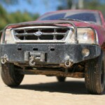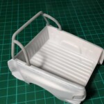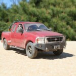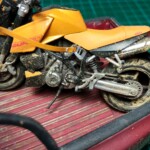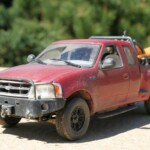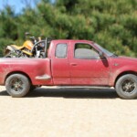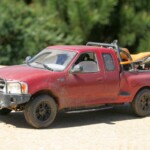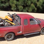 Przez nieuwagę jedna z pomalowanych części dostała prysznic z izopropanolu. Żeby go nie przemalowywać postanowiłem go ubrudzić. Stąd pomysł na pseudo terenowy model motocykla na pace. A żeby nie wyglądał zbyt „miastowo” dorobiłem orurowanie, nowy zderzak z wyciągarką. Dokupiłem za parę złotych gotowy model KTM Duke i przypiąłem go dorobionym pasem. Szukając inspiracji w necie zobaczyłem takie autko na czarnych felgach. Wydrukowałem sobie podobne. Usmarowałem całość błotem i kurzem. Ot i cała historia.