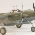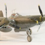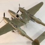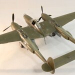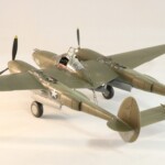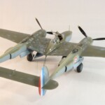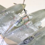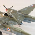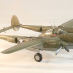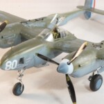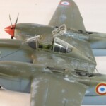 W międzyczasie Tamiya wypuściła pięknego i zdecydowanie najlepszego na rynku P38F/G i postanowiłem skorzystać i zrobić „Jeanne #80” jeszcze raz, tym razem z jednokolorowym wykończeniem na górnych powierzchniach. #80 był już starszą maszyną i przez to dosyć wrażliwa farba Haze Blue bardzo się ścierała tak więc Francuzi postanowili go pomalować. Pierwsza wersja to była dwukolorowa farba zielona i brązowa, być może coś z zasobów RAF bądź USAAF a druga wersja zakładała jednokolorowe pokrycie Olive Drab, który też dostyć szybko ulegał starciom i odpryskom. Tym razem starałem się pokazać dwu stopniowe fazy zniszczeń farby. Pierwsza to aluminium prześwitujące przez Haze Blue a druga to ta kombinacja prześwitująca przez wycierany, i odpryskujący Olive Drab. Wyszło to mniej więcej tak.