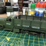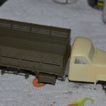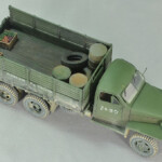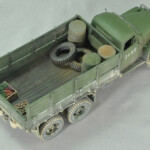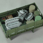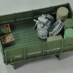Podczas budowy wiedziałem też że nie chce mi się dawać typowego modelarskiego ładunku, czyli drewnianych pudeł „z czymś” i beczek z paliwem. Od razu przyszło mi do głowy dać skrzynki z warzywami z jednego z zestawów Black Dog, ale do tego chciałem dodać coś czego normalnie w modelach nie widać. Jak widać ze zdjęć próbowałem wykombinować czy nie dało by się wrzucic tam silnika z T-34. W końcu wybór jednak padł na zapasowe opony z zestawu MP Models (MP Masters?). No i oczywiście wszystko uzupełniłem beczkami z paliwem…