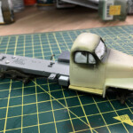 Na koniec postanowiłem że nie będę się bawił w sztukowanie szybek z użyciem blaszek z zestawu Miga. O wiele łatwiej było mi je zeskanować, obrobić w Corel Draw i wydrukować sobie maski w wycinarce Cameo 4. Probowałem zmusić tą wycinarkę do wycięcia szybek bezpośrednio w przezroczystym plastiku, ale coś mi nie wychodziło. Zamiast się męczyć i kombinować z ustawieniami, wyciąłem zwyczajne maski, przykleiłem je do plastiku i wyciąłem kształt nożyczkami. Na to dałem mniejsze maski po obu stronach „szkła” i pomalowałem takim samym kolorem jak resztę modelu. Efekt wyszedł raczej zadowalający. Z jakiegoś metra wyglądają one na w miarę porządne szybki z ramkami :).