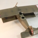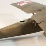 Połówki kadłuba wymagają sporo obróbki na łączeniach a potem po schowaniu szwów łączenia należy odtworzyć tą specyficzną „falistą blachę” która pokrywała 2/3 modelu od śmigła. Co ciekawe to żłobki nie są równe ale i w modelu i na zdjęciach wyraźnie faliste a więc „od ręki” lepiej je odtwarzać niż od linijki. Wydaje mi się że udało mi się to w miarę okay. Ogon i statecznik pasują dosyć poprawnie. W statecznikach poziomych wywierciłem maleńkie dziurki przez które przechodziły linki sterów wychodzące z kadłuba i konrolujące lotki na ogonie.