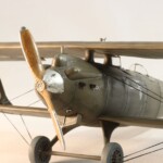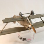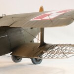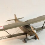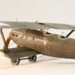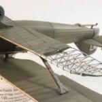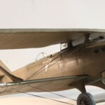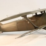 I tutaj zrobiłem pierwszy błąd. Otóż stereotypowałem że przecież naturalnym jest że te elementy były drewniane, nieprawdaż? Otóż nie, Breguet był pierwszym samolotem praktycznie cały o konstrukcji metalowego duraluminum łącznie ze skrzydłami. Jedynie pokrycie 1/3 tylnej części kadłuba i elementy nośne jak skrzydła i ogon były pokryte płótnem, reszta była duraluminowa. Tak więc pieczołowicie wykonany „efekt drewna” został pokryty kolorem duraluminum. Jak już byłem zadowolony z efektu tego szkieletu to….z bijącym sercem wsadziłem dolny płat do imadła i obciąłem go tak samo jak i płat prawy. Od tego punktu nie było już powrotu i Breguet mógł być tylko wykończony jako „nadłamany” Kopciuszek…albo wcale.