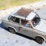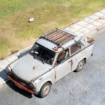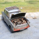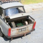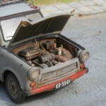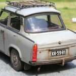 Model Revella to właściwie „Trabant 601S”. Zrobiłem downgrade i pozbyłem się literki „S”. Wiązało się to z kilkoma przeróbkami. Na zewnątrz mój Trabant ma inne zderzaki, nie ma przednich halogenów, a z tyłu nie ma światła cofania i światła przeciwmgielnego. Przerobiłem przednie felgi i piasty pozbywając się plastikowych kołpaczków. We wnętrzu są inne niż zestawowe fotele, zwykłe pasy bezpieczeństwa (nie bezwładnościowe), zamiast radia jest zaślepka. Inna też jest deska rozdzielcza. Dorobiłem podsufitkę, plastikowe uchwyty na słupkach, osłony przeciwsłoneczne, enerdowską klimatyzację pod przednią szybą. Na tylnej półce zasiadł piesek z kiwającym się łebkiem. Wyposażenie bagażnika (kufra)- kanister, lejek, butelka z Mixolem (taki olej do dwusuwów) są drukowane z żywicy. Pompka, skrzynka narzędziowa i wykładzina wyrzeźbione są z mchu i paproci. Jest też koło rezerwowe, ale to dała fabryka.