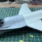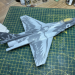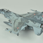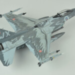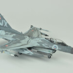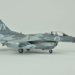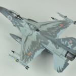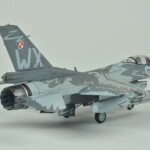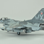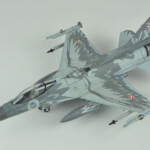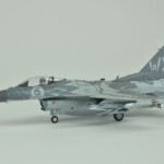 Po walce (sorry, chciałem powiedzieć „budowie”) przyszła kolej na malowanie. Tutaj z pomocą przyszły w miarę nowe kolory szarych z linii akryli Miga. O ile FS36375 pasował prosto z butelki to FS36270 miał dla mnie odrobinę za mało kontrastu. Zdaję sobie sprawę, że jest to pewnie złudzenie optyczne (bo było by raczej nielogiczne malowanie go w rzeczywistosci jakimś innym kolorem), ale postanowiłem go trochę przyciemnić. Wyszło odrobinę za bardzo przyciemnione :), ale pasowało mi do zdjęć i postanowiłem zostawić jak jest. Maski Model Makera w większości zadziałały bez problemów. Są wycięte z Oramasku 810 (którego notabene ja też używam i bardzo sobie chwalę), także nie było jakichkolwiek problemów z ich nakładaniem i potem ze zdejmowaniem. Jedyne co bym poprawił to zaprojektowanie przejścia kadłub – statecznik pionowy. Są tak zrobione, że albo trzeba je nakładać przed przyklejeniem statecznika, albo je gdzieniegdzie ponadcinać. Nie pomyślałem o tym i musiałem zrobić to drugie. Poza tym położenie dużych elementów może być odrobinę frustrujące – dopiero po pomalowaniu się zorientowałem że wprawdzie „dziób” kruka jest gdzie powinien (bo od niego zacząłem), a „skrzydła” wyszły odrobinę przesunięte do tyłu.