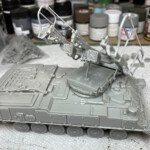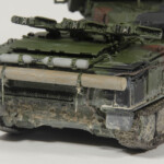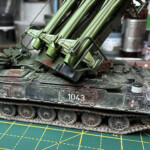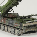 Jako że moje modele pancerki nie mogą być czyste :), po malowaniu przyszła pora na brudzenie. Jak widać z pierwszego zdjęcia (znalezionego na necie) moją inspiracją była maszyna na poligonie nad Bałtykiem (z rakietami na których oznaczenia wyglądają na Słowackie). Pierwsze próby osiągnięcia takiego efektu się raczej nie udały. Chciałem sobie ułatwić życie i zamiast kombinować z pre-shading aerografem i bawienie się pigmentami, stwierdziłem że użyję emaliowego wynalazku Miga (Heavy Mud – Dry Light Soil, A.MIG 1709). Niestety nie zadziałało to jak myślałem. Po zmyciu większości z kadłuba, nałożyłem grubszą warstwę na koła i gąsienice, a sam kadłub przykurzyłem różnymi odcieniami pasteli.