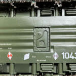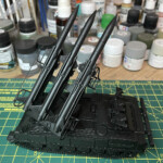 Jeżeli chodzi o drewnianą belkę, to kusiło mnie pomalowanie jej po prostu na zielono. Niestety, na wszystkich zdjęciach polskich maszyn jakie widziałem, te belki są zostawione „jak były”. Do pomocy przyszły akryle Vallejo (głównie „old wood” i „us gray”) i tzw. „mokra paleta”. Po zakończeniu zabawy, na to wszystko poszedł gloss Alclada i emaliowy wash AK (Track Wash, AK 063).