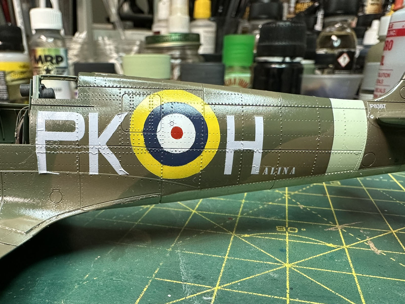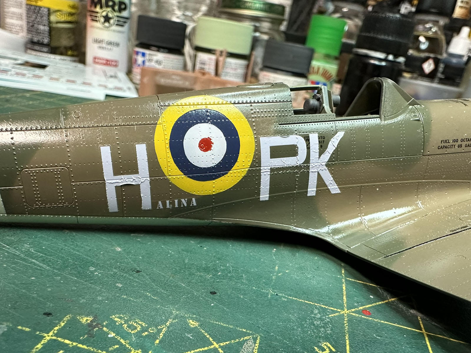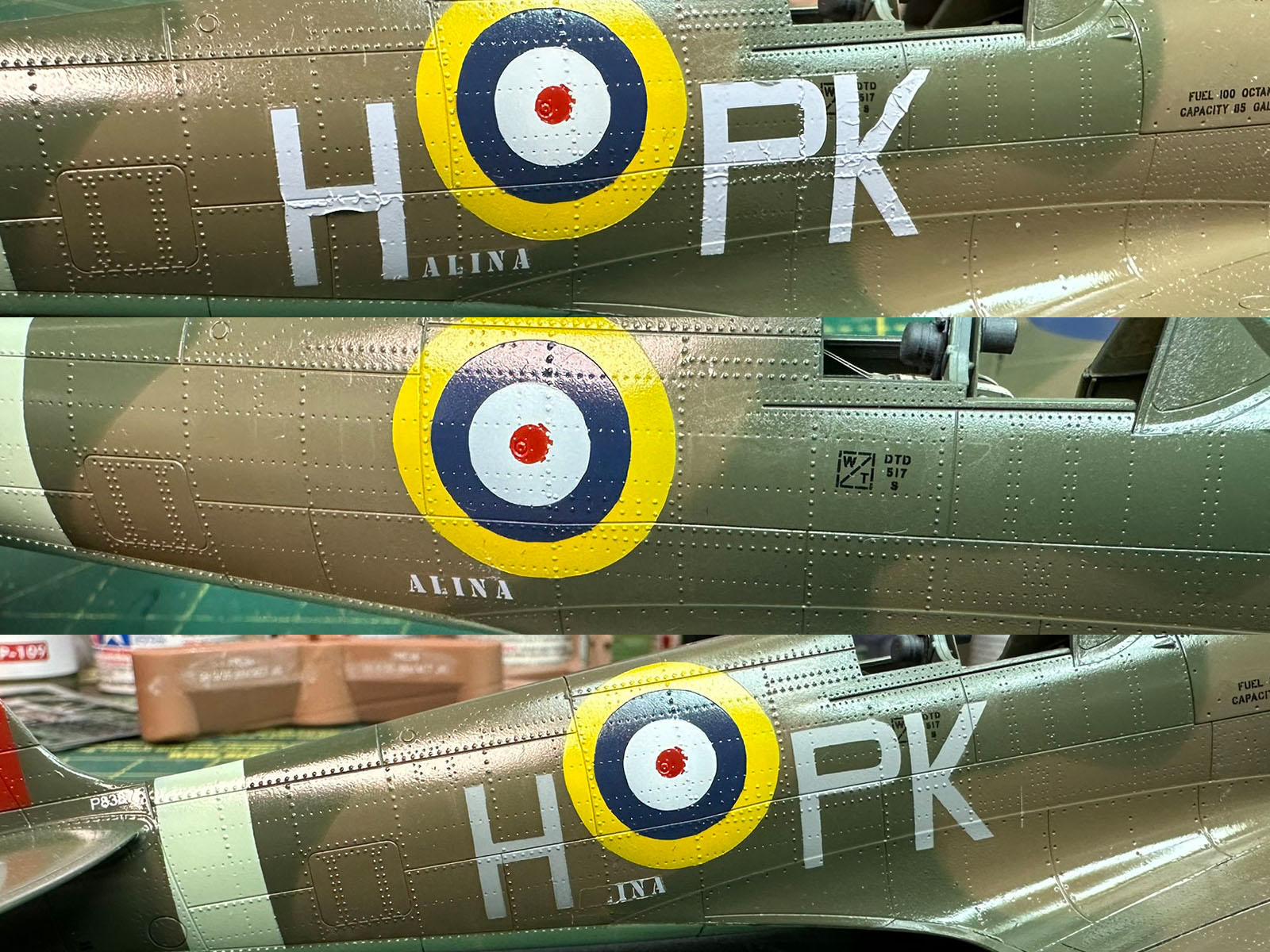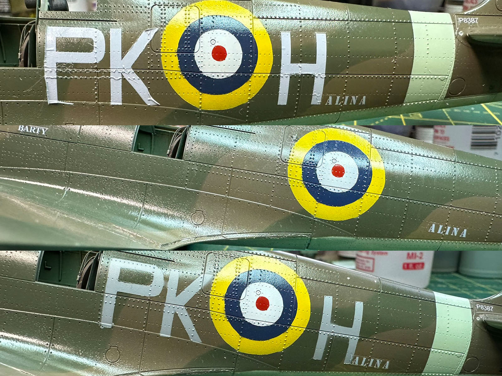 Normalnie litery kodowe też bym „przerobił” na maski, ale w tym przypadku stwierdziłem że użyję kalek, bo chciałem żeby „alina” była w tym samym kolorze co „H”. Niestety, jak widać poniżej nic z tego nie wyszło. Nie mam pojęcia co się stało, ale przez noc te kalki się pomarszczyły i musiałem je oderwać. Jak już skończyłem z nimi walczyć to delikatnie przeszlifowałem te części kadłuba, pomalowałem znaki i litery od masek jakie sobie wyciąłem i poprosiłem Tomka o wydrukowanie mi brakujących napisów. Na szczęscie okazało się że miał on kolor jaki pasował i mogł mi wydrukować „Halinę” i „Barty” którego brakowało z jednej strony kadłuba.